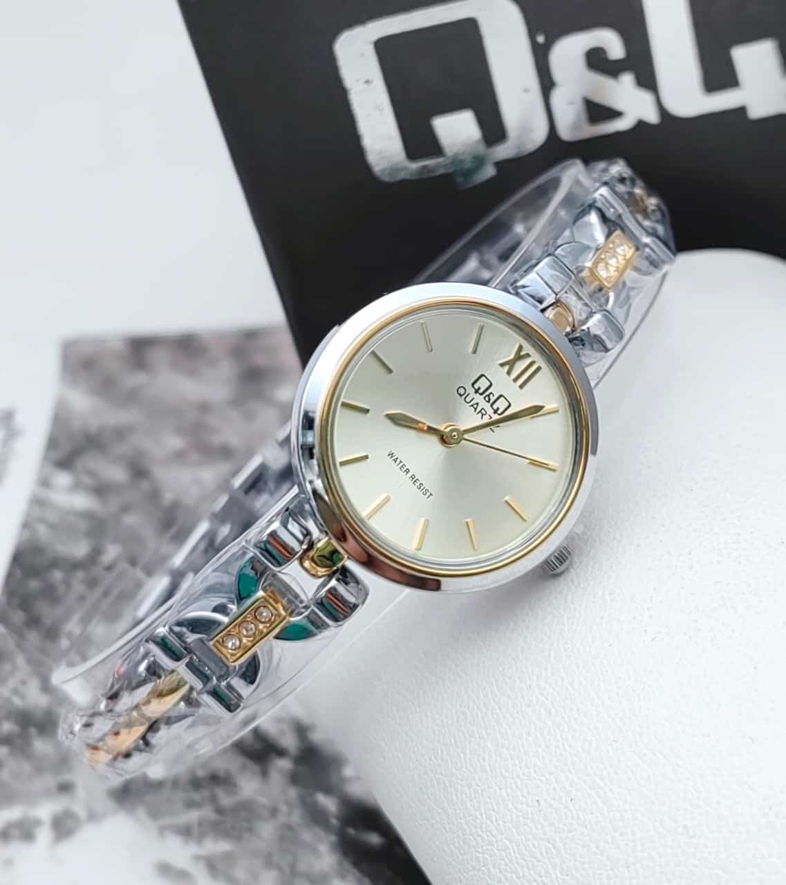 Q&Q 🌐👱‍♀ PLATEADO CON DETALLES DORADO Y CARATULA BLANCA . Original ☑️PULSO JOYITA ☑️ RESISTENTE AL AGUA